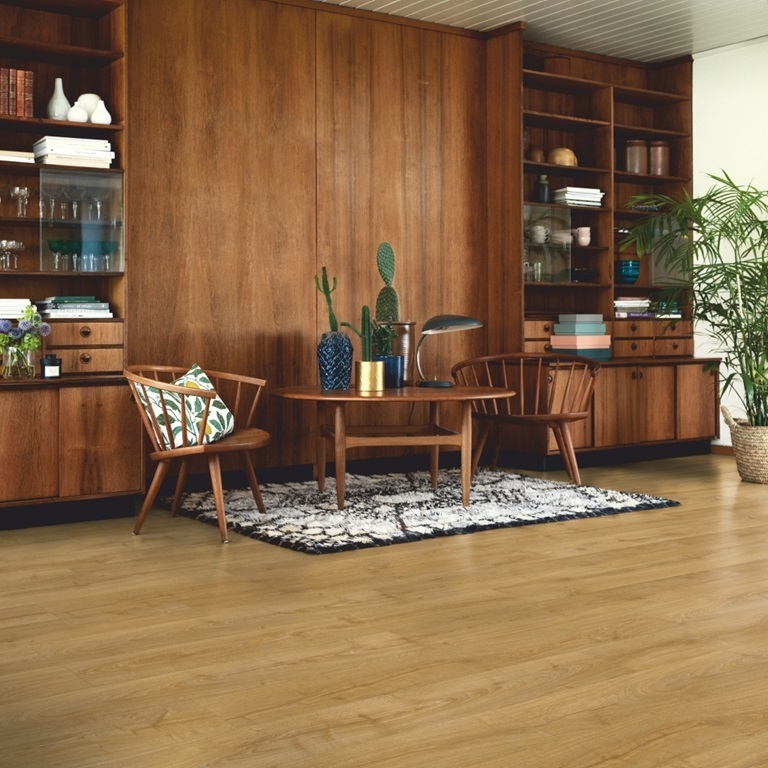 Модель «Приусадебный Дуб» выполнена в светлом древесном оттенке с лёгкой текстурой. Покрытие визуально расширяет пространство и придаёт интерьеру тепло. Технология AquaSafe защищает ламинат от влаги и облегчает уход.