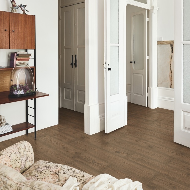 Благородный коричневый оттенок и фактурная поверхность создают атмосферу тёплого и солидного интерьера. Ламинат устойчив к бытовому износу и не боится влаги.