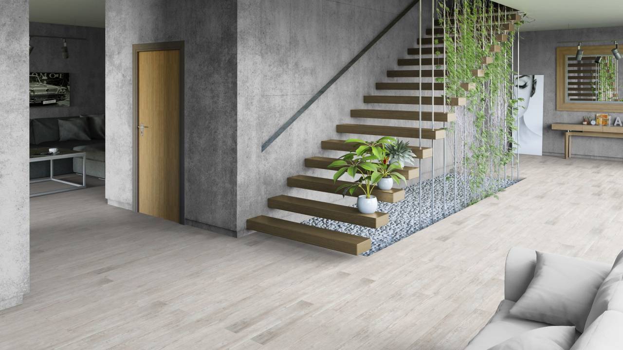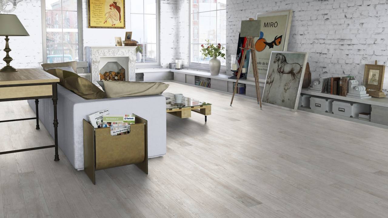 Ламинат Tarkett Gallery «Моне» отличается современным форматом узкой доски шириной 116 мм. Благодаря толщине 12 мм покрытие выглядит солидно и надёжно, а интерьер визуально получает больше свободы и простора.